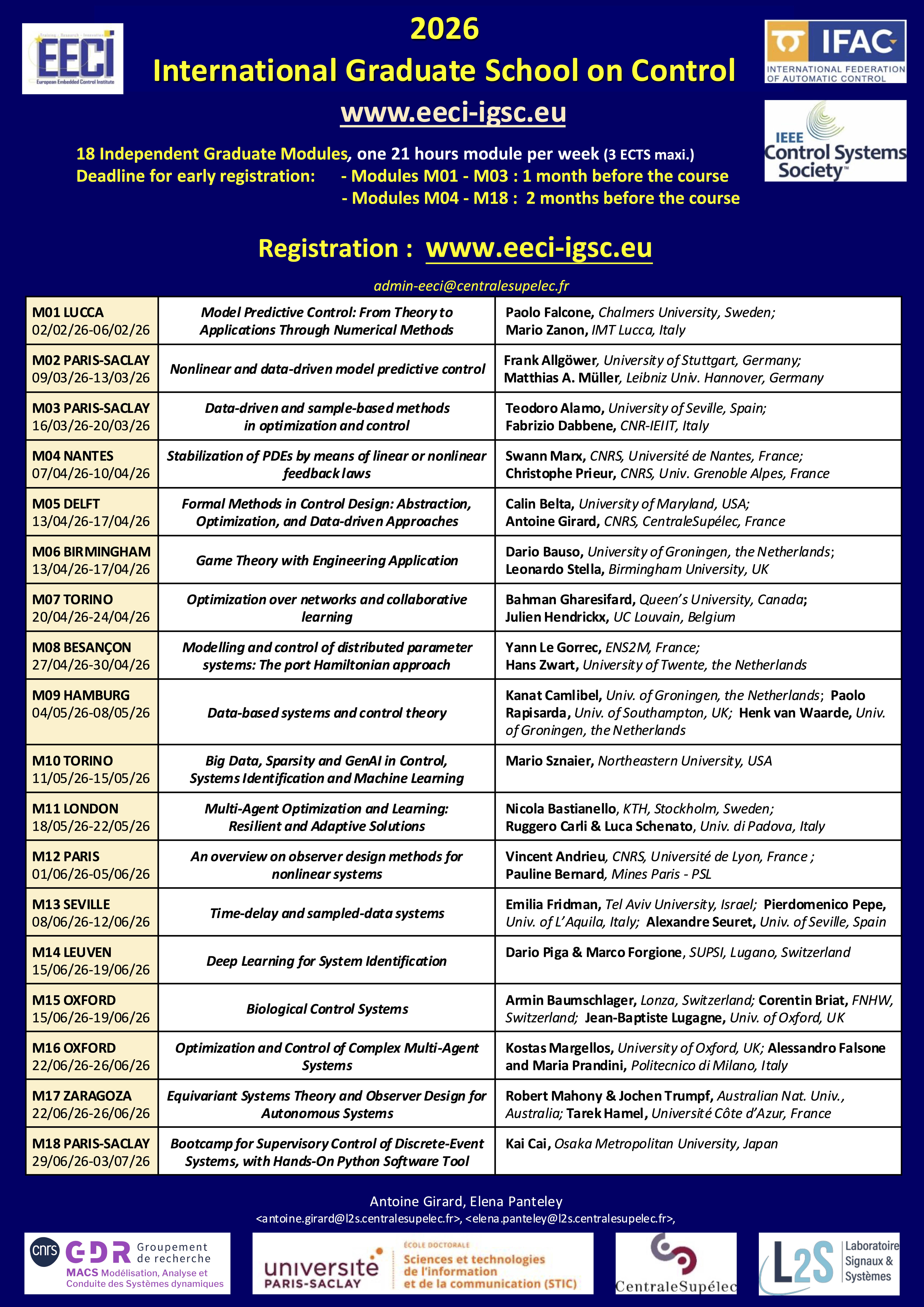 Since the creation of EECI (European Embedded Control Institute), IGSC (International Graduate School on Control) Program is organized every year, inviting the best experts to teach recognized topical subjects on networked and embedded control, in esteemed universities and institutes all over the world.